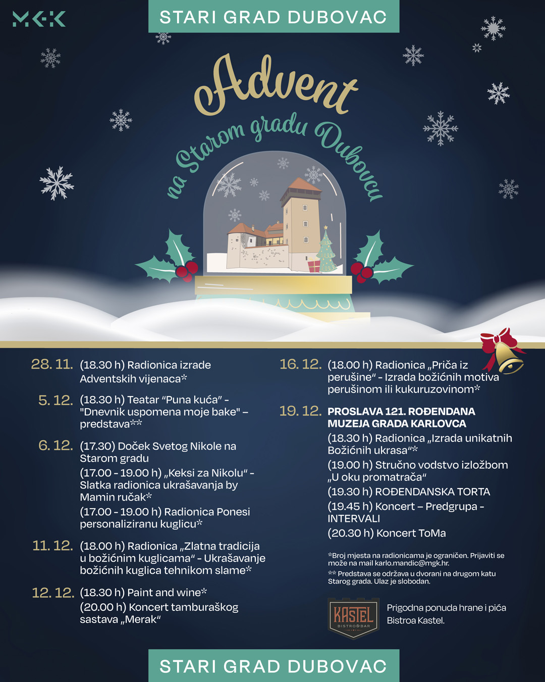 I ove godine Stari grad Dubovac pretvara se u najzabavniju božićnu pozornicu u gradu! Od kraja studenoga do sredine prosinca posjetitelje očekuje niz kreativnih, edukativnih i zabavnih događanja koja spajaju tradiciju, umjetnost i obiteljsko druženje u autentičnom ambijentu jednog od najljepših karlovačkih simbola.
